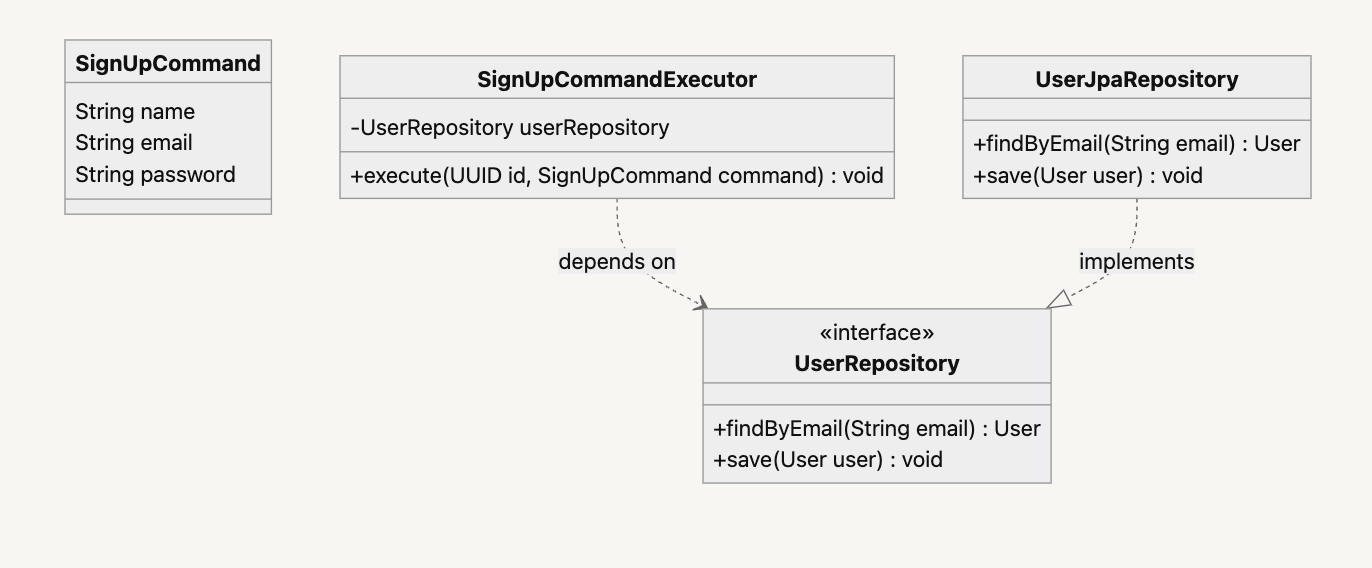 유저 모델링 또한 사용자의 회원가입 명령을 해결 하기 위해서는 다양한 모델이 필요하다. 우선 회원가입 명령을 실행 하는 명령 실행기, 명령 메세지에 대한 정의, 회원가입 명령을 수행 하고 유저 모델을 영속화 하기 위해 필요한 저장소 추상화인 repository 설계 까지 필요하다.